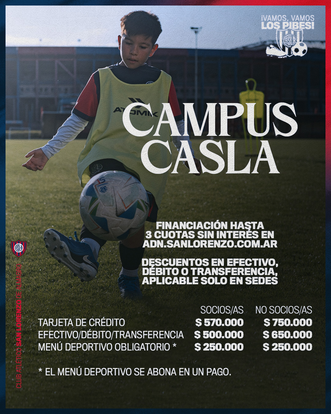 "Vamos, vamos los pibes..." es ese cantito que se replica en el Bidegain una y otra vez, resumiendo el orgullo de cuervos y cuervas ante lo que transmiten los jugadores de nuestra cantera... Siguiendo esa línea, San Lorenzo presenta una propuesta innovadora y única para el verano 2026. Se viene el Campus CASLA, un programa integral de fúbol de Alto Rendimiento, diseñado para niños y niñas de 7 a 14 años, pensado para que cada participante eleve su nivel de juego a través de un entrenamiento planificado, estructurado y de máxima calidad. El objetivo de fondo apunta a potenciar tanto las habilidades deportivas como los valores que caracterizan a nuestros equipos azulgranas. Ya se encuentra abierta la reserva de vacantes, que son LIMITADAS.